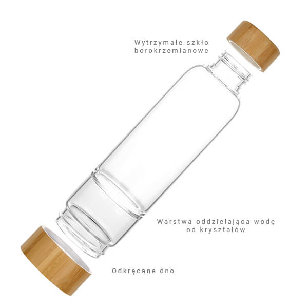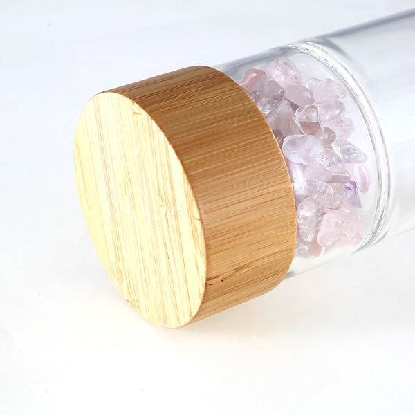 - Zamknij butelkę za pomocą drewnianego wieczka i korzystaj z niej podczas dnia. Ciesz się aromatem i smakiem napoju wzbogaconego o naturalne właściwości kamieni kwarcu.