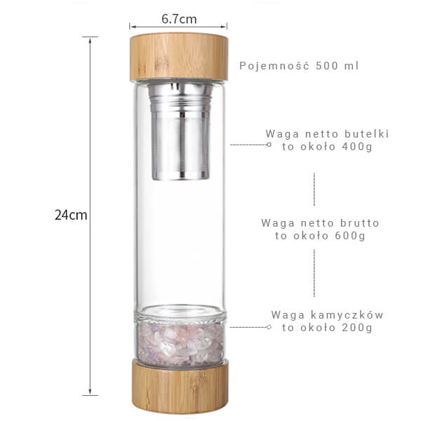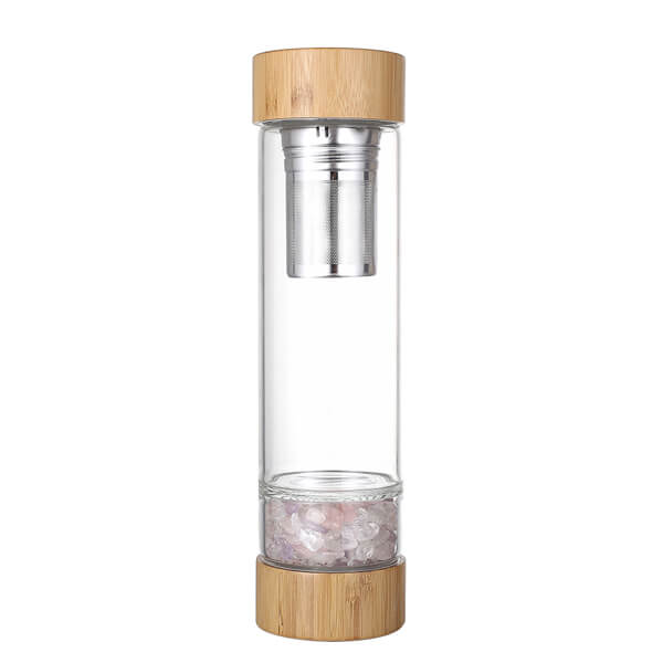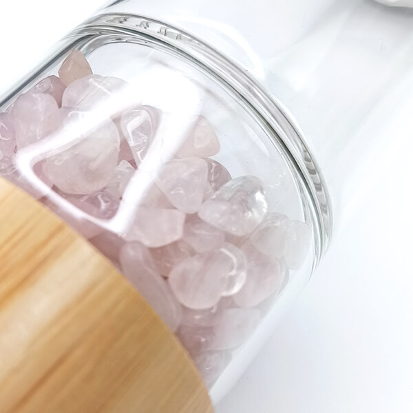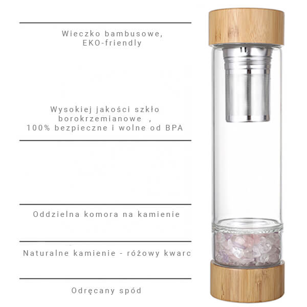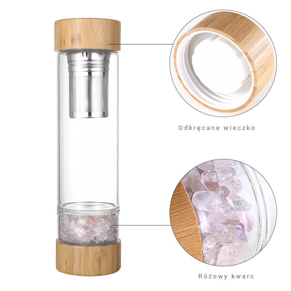 Butelka szklana z kamieniami kwarcu różowego z sitkiem YEYE