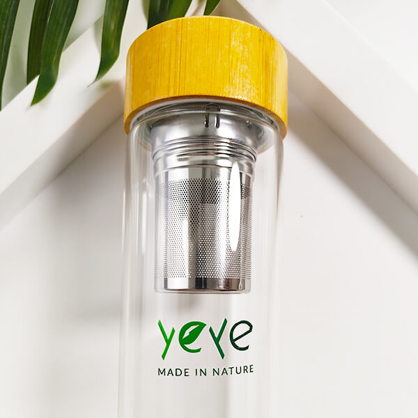 Szklana butelka z sitkiem i zielonym jadeitem YEYE Made in Nature została zaprojektowana z myślą o osobach, które cenią naturalne materiały, prostotę i praktyczne rozwiązania. Wykonana ze szkła borokrzemowego, odpornego na zmiany temperatur, sprawdzi się zarówno do gorącej herbaty, jak i chłodnych napojów.