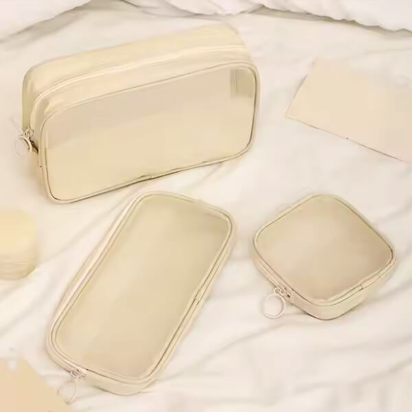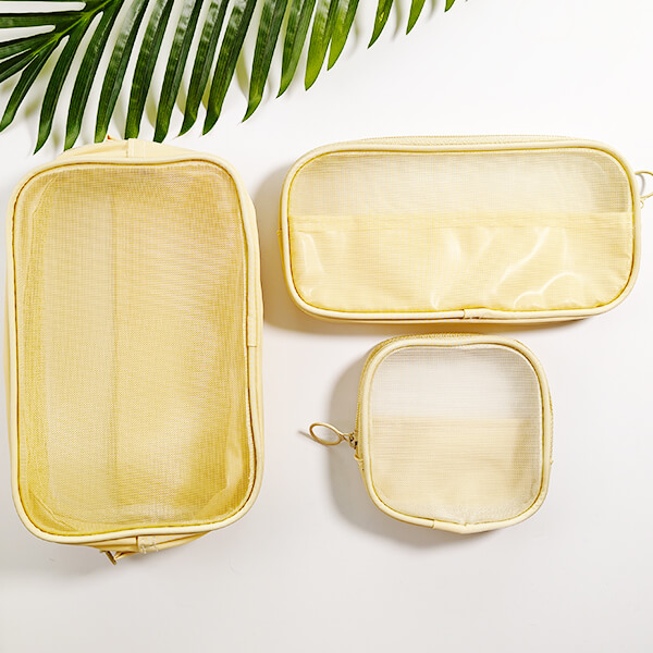 Zestaw trzech kosmetyczek z siateczki został zaprojektowany z myślą o funkcjonalnej organizacji codziennych drobiazgów. Każda kosmetyczka wykonana jest z trwałego, lekkiego materiału, który umożliwia szybki podgląd zawartości bez konieczności otwierania zamka.