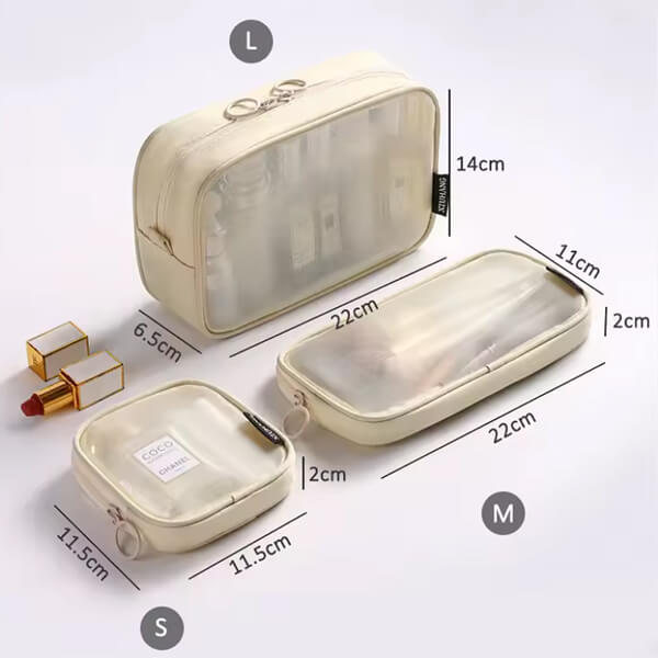 Trzy różne rozmiary pozwalają dopasować kosmetyczkę do aktualnych potrzeb – od przechowywania pomadek i biżuterii, przez kosmetyki kolorowe, aż po pełnowymiarowe produkty pielęgnacyjne. Solidny zamek z dużym uchwytem ułatwia otwieranie nawet wilgotnymi dłońmi, co sprawdza się szczególnie w łazience, saunie czy na basenie.