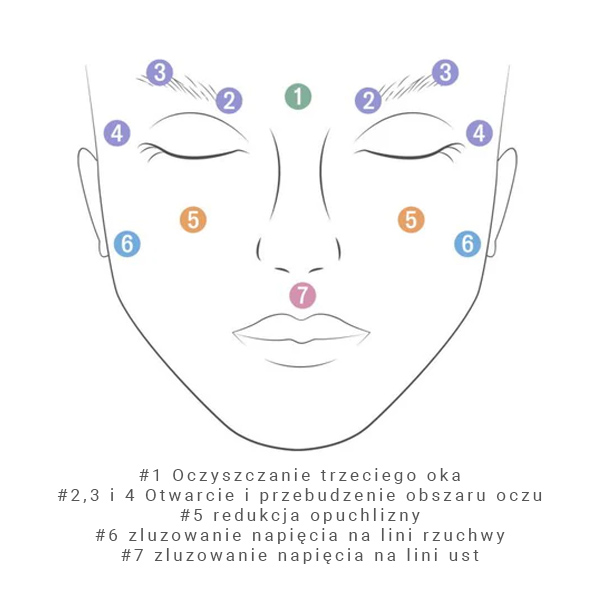 Wykonuj delikatny ucisk na wskazane punkty na twarzy. Następnie delikatnie masuj i zwiększaj nacisk. Na koniec przesuń stick do zewnątrz twarzy.