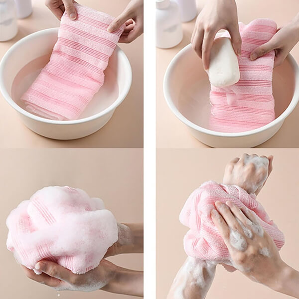 Namocz ręcznik wodą i delikatnie masuj nim całe ciało. Możesz dodać żel lub mydło. Po użyciu wypłucz, odsącz wodę i powieś do wyschnięcia. Zaleca się regularne pranie.