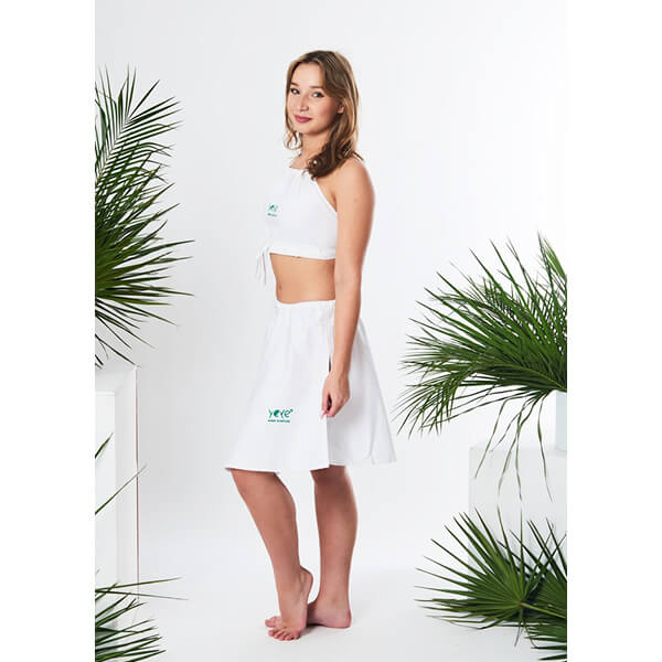 Strój PRO dla saunamistrzyni od YEYE został zaprojektowany z myślą o pracy w wysokiej temperaturze i wilgotności. Zestaw składa się z topu Bembea z regulowanym wiązaniem oraz lekkiej spódnicy na elastycznej gumce, która nie uciska i nie ogranicza ruchów podczas prowadzenia ceremonii.