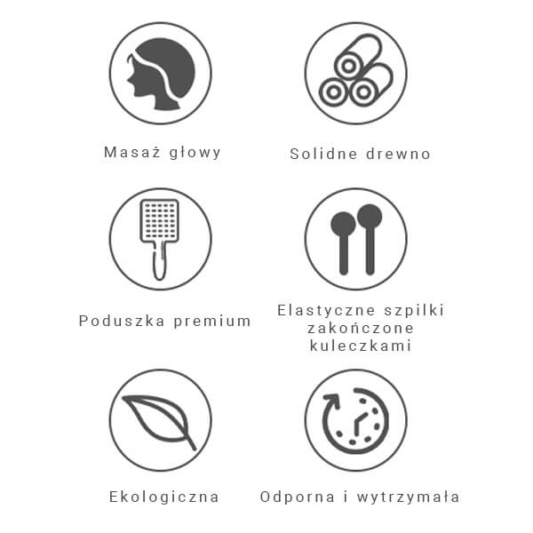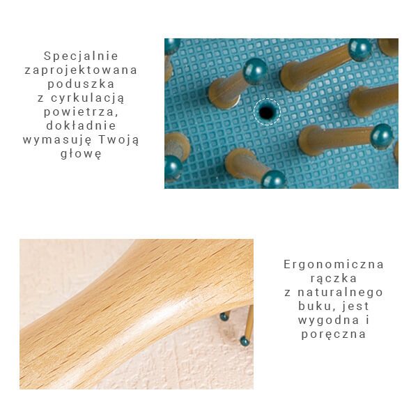 • Stymulacja Skóry Głowy: Elastyczne, plastikowe szpilki oraz kauczukowa, pneumatyczna poduszka zapewniają przyjemne uczucie podczas czesania, jednocześnie masują skórę głowy, poprawiając krążenie krwi i wspierając zdrowy wzrost włosów.