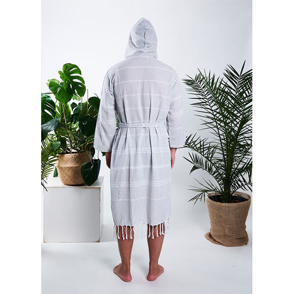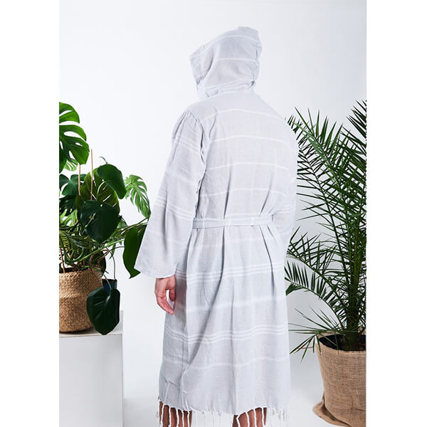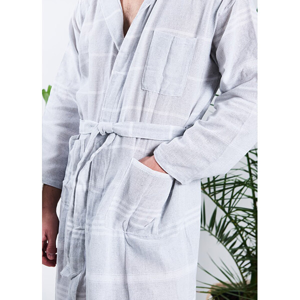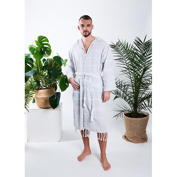 Hammam to ręcznik idealny. Stosowany tradycyjnie w łaźni tureckiej, do zarzucenia na ramiona w trakcie seansu lub owinięcia wokół bioder po kąpieli. Materiał oraz technika tkania ręcznika sprawia, że jest miękki, lekki, szybko wchłania wilgoć i szybko schnie. Dodatkowo jest lekki i łatwo można go zapakować do torby, gdyż nie zajmuje dużo miejsca. Dlatego wykorzystaliśmy ten rewelacyjny materiał do stworzenia szlafroka, który można założyć po seansie saunowym, czy po kąpieli w ciepły letni dzień. Szlafrok posiada wygodne kieszenie, pasek oraz obszerny kaptur, zakończony na dole tradycyjnymi frędzelkami.