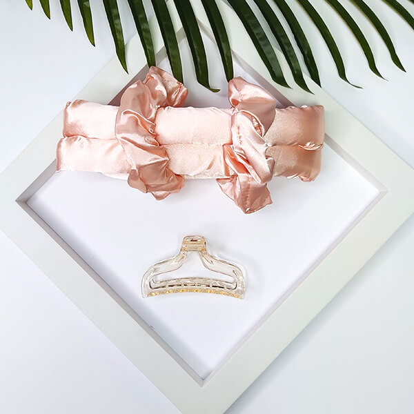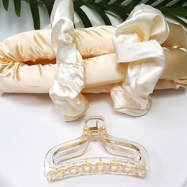 Zestaw zawiera wałek z satyny, 2 miękkie gumki, spinkę oraz praktyczny woreczek do przechowywania. Satynowa powierzchnia jest niezwykle delikatna i gładka, dzięki czemu włosy nie plączą się ani nie puszą. Wałek sprawdzi się zarówno podczas nocnego snu, jak i krótszej stylizacji w ciągu dnia.