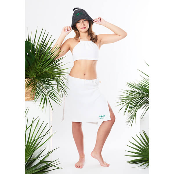 Zestaw do sauny YEYE zapewnia komfort i swobodę dzięki praktycznemu strojowi z bawełnianej frotte oraz skuteczną ochronę przed przegrzaniem dzięki czapce z naturalnej wełny filcowanej.